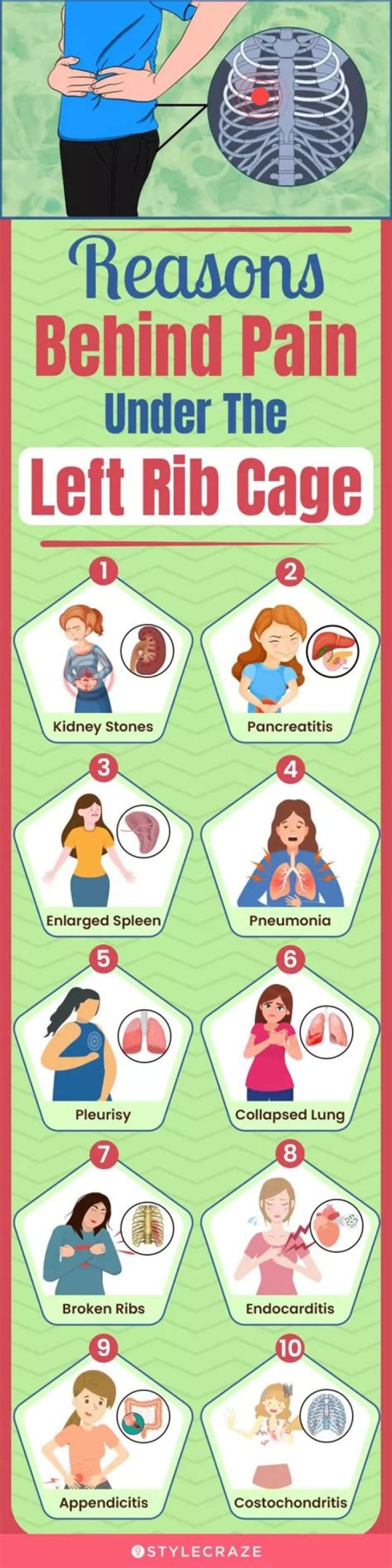 Causes of left rib painOn the left side, this includes your heart, left lung, pancreas, spleen, stomach, and left kidney. When any of these organs are infected, inflamed, or injured, pain can radiate under and around your left rib cage. It's also possible to injure your ribs themselves.