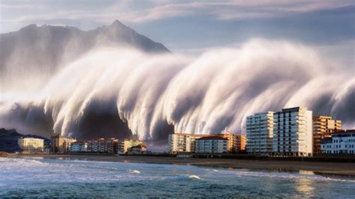 2. Fog “Tsunami” At first glance, this jarring sight looks like a giant tsunami rolling in from the ocean, but it's actually a massive amount of fog. When conditions are just right in late spring or early summer, the condensation from warm air merging with cool ocean water can create this dramatic effect.
