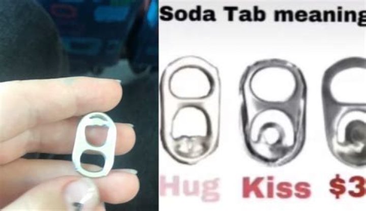 The soda tab either has a big hole at the bottom, which means 'hug', a semi circle with a smaller hole underneath it, which means 'kiss', or just a semicircle hole, which means 'sex'. For example, if you get the 'kiss' soda tab, it means you'll get a kiss from someone you fancy in the next few days.Why do Shriners collect can tabs?