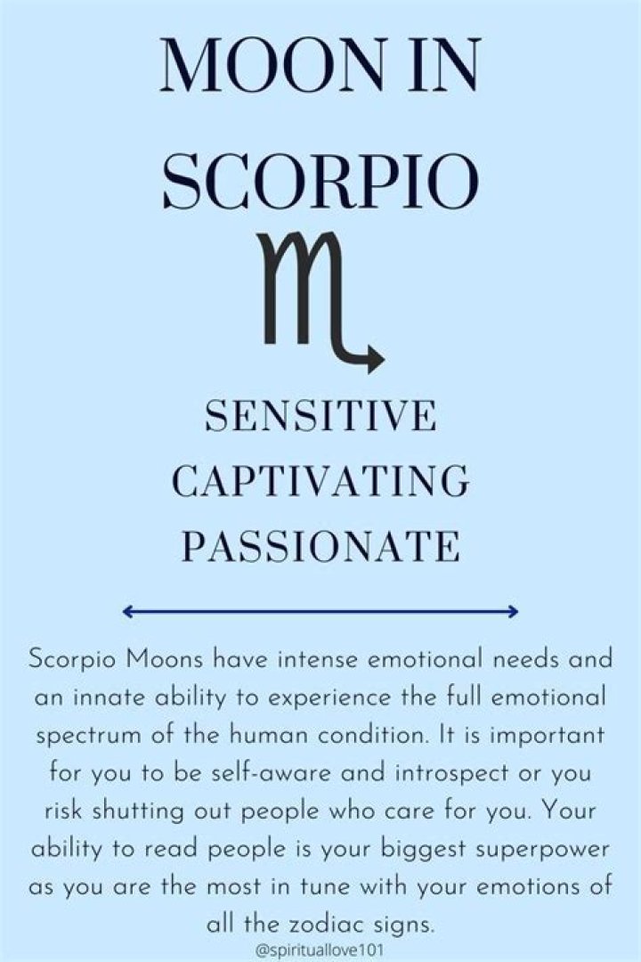 Born with the Moon in Scorpio, you are likely to be sensitive and loyal, but have intense emotional needs. Scorpio is a Water sign, which relates to the emotional, psychological and spiritual dimensions of life. You are likely to give the impression of being perceptive, powerful, and transformational.What zodiac signs hide their feelings?
