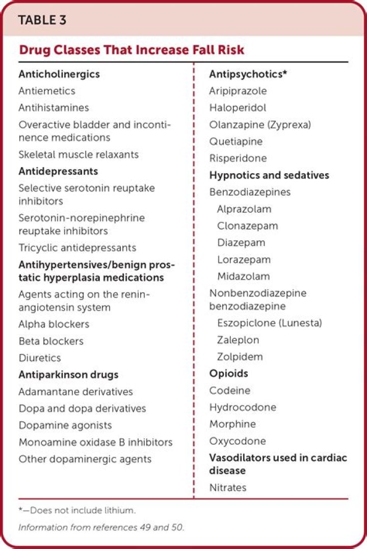 The authors presented a significant association between falls and the use of sedatives and hypnotics, antidepressants and benzodiazepines. The use of antidepressants had the strongest association with falls. Other drug classes have also been associated with an increased fall risk.What medications can increase fall risk?