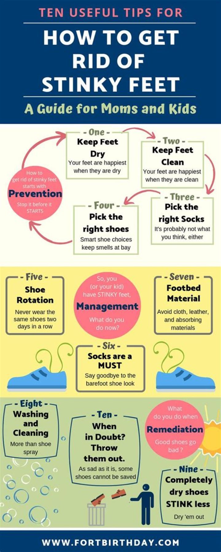 Soak your feet in a mixture of Epsom salts and water, or vinegar and water. With Epsom salts, combine half a cup in a tub of warm water and soak your feet for 15 minutes. The salts will pull the moisture out of your skin, which makes for a less than ideal environment for the bacteria.How to get rid of stinky, smelly feet.