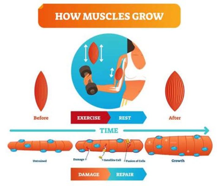 Muscle hypertrophy occurs when the fibers of the muscles sustain damage or injury. The body repairs damaged fibers by fusing them, which increases the mass and size of the muscles. Certain hormones, including testosterone, human growth hormone, and insulin growth factor, also play a role in muscle growth and repair.