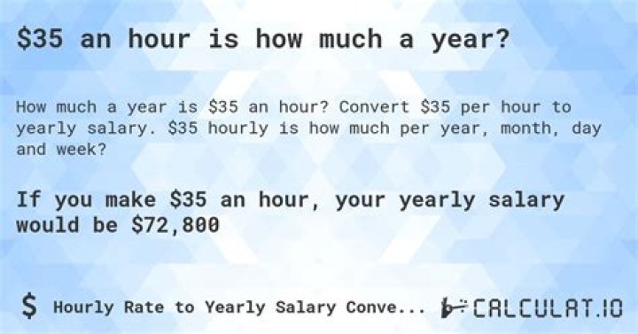 Is $35 an Hour a Good Salary? Making $35 an hour will put you in one of the higher tiers of income among Americans. Only ~30% of household incomes make more than the $66,560 salary that $35 an hour provides.How much a year is $35 an hour?