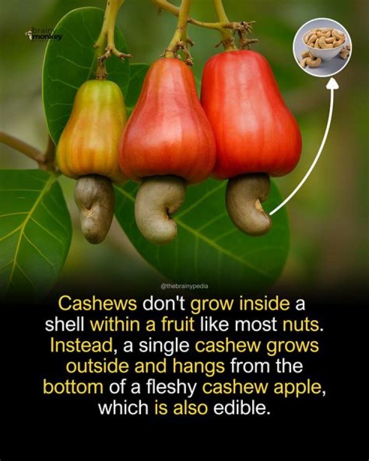 Cashews are originally seeds and come from the drupe that develops from the tip of the cashew apple. The tree produces a pear-shaped fruit called a cashew fruit, which is technically a false fruit or a pseudofruit.