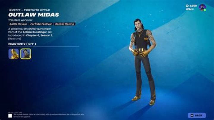 The Shadow Midas Skin is an Epic Fortnite Outfit from the Shadow Seekers set. It was released on October 29th, 2021 and was last available 172 days ago. It can be purchased from the Item Shop for 1,500 V-Bucks when listed. Shadow Midas was first added to the game in Fortnite Chapter 2 Season 8.