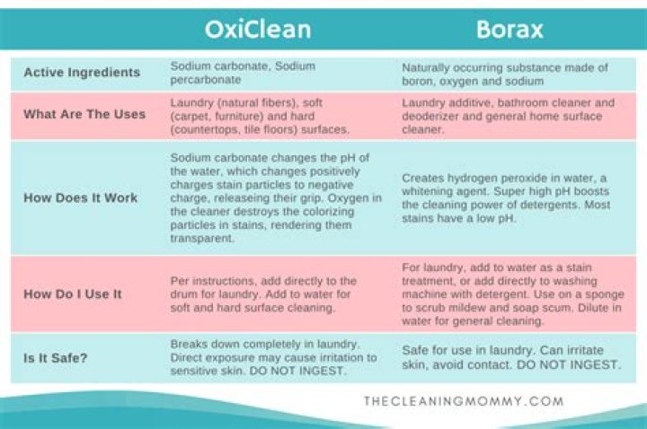 Ingredients: Borax is a naturally occurring compound made up of boron, sodium, and oxygen. OxiClean's active ingredient is sodium percarbonate, which breaks down into hydrogen peroxide when mixed with water. Uses: Borax is most commonly used as a laundry aid, although it can be an all-purpose cleaner as well.Is washing soda the same as borax?
