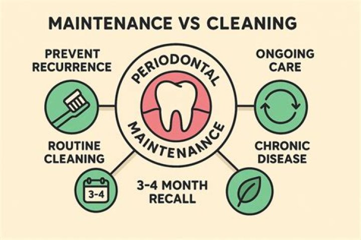 Also, regular cleanings are done as preventative care, while periodontal maintenance takes care of existing problems with your oral health. When you go for periodontal maintenance, the hygienist will remove tartar just like with a regular cleaning. They'll get in between your teeth and down to your gums.How often is periodontal maintenance?