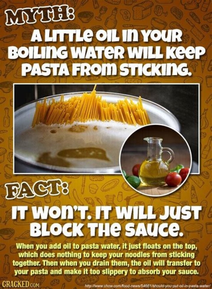 Most veteran pasta makers add oil to their pasta water to prevent the noodles from sticking together, or to keep the water from boiling over. But their best intentions could backfire, Curiosity reports. (By the way, there's only one right way to use this pasta-making utensil, too.)