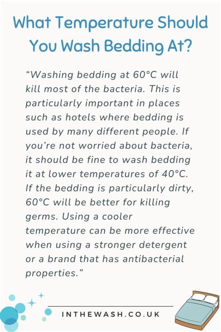 When washing bedding you want to wash at 60 degrees on a long wash ie 2 hours plus to make sure that any sweat, dander, dust or other nasties are killed and then removed. Wash all bedding on a full cycle 60-degree wash. Colder temperatures may not kill all the bacteria or remove sweat as effectively.Do you wash bedding on 40 or 60?