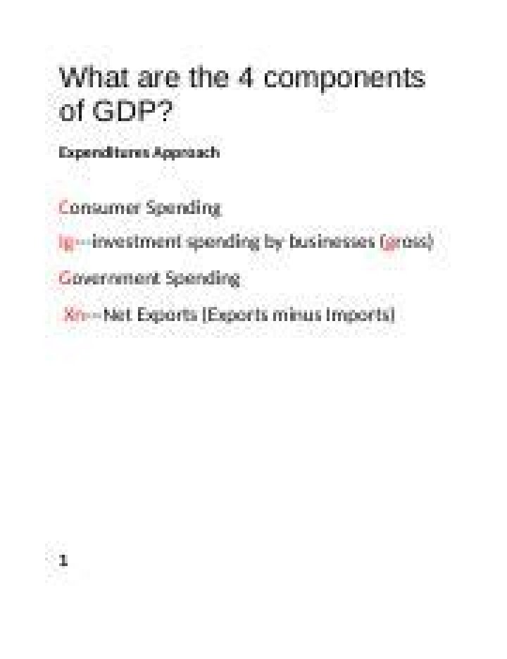 When using the expenditures approach to calculating GDP the components are consumption, investment, government spending, exports, and imports.