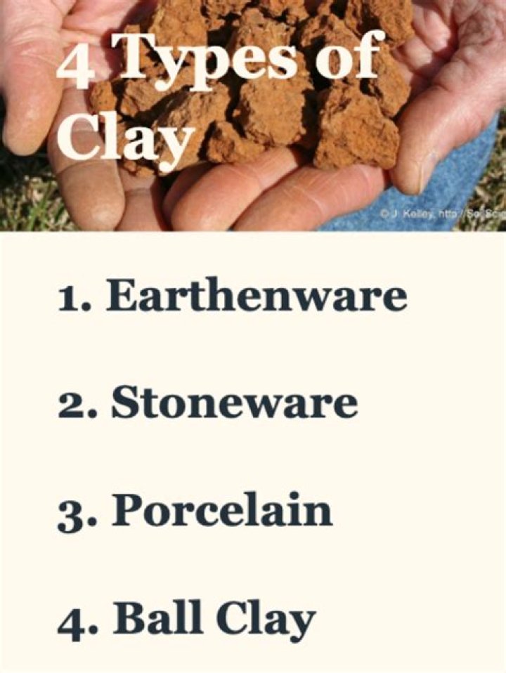 The 4 types of clay for pottery are earthenware, stoneware, porcelain, and ball clay.