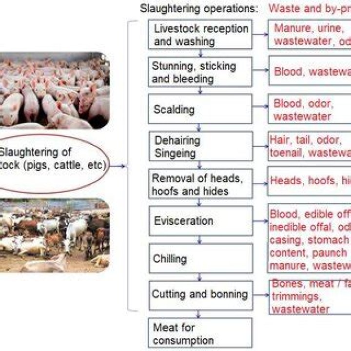 Animal slaughter and processing produces very strong organic waste from body fluids, such as blood, and gut contents. The primary steps in processing livestock include rendering and bleeding, scalding and/or skin removal, internal organ evisceration, washing, chilling, and cooling, packaging, and cleanup.What are the three types of slaughter premises?