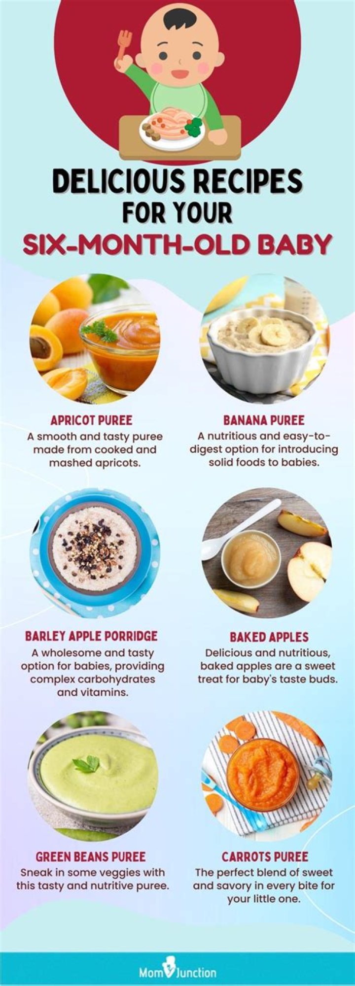 At 6 months, your baby will still be getting most of their nutrition from breast milk or formula. Start to introduce solid foods around 6 months of age (not before 4 months). Your baby will take only small amounts of solid foods at first. Start feeding your baby solids once a day, building to 2 or 3 times a day.Can I give toast to my 6 month old?