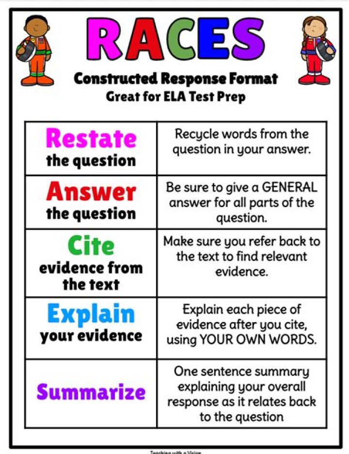 RACES: R – Restate the question. A – Answer the question. C – Cite the text evidence. E – Explain and extend the evidence.