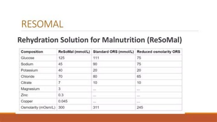 At that time WHO guidance advised that children with SAM should be given a modified version of oral rehydration solution (ORS) called ReSoMal (rehydration solution for malnutrition), which has lower sodium, higher potassium and glucose and lower osmolarity than Old WHO ORS ( Table 2) 5, 6.Why is ReSoMal preferred in malnutrition?