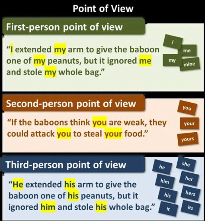 The common points of view from which an author can narrate a story are: 1st person POV uses the pronouns “I” and “we.” 2nd person POV uses the pronoun “you.” 3rd person POV uses the pronouns “she,” “he,” “they,” and “it.” 3rd person limited is when the narrator only knows the thoughts of one person.What are the 4 points of view?