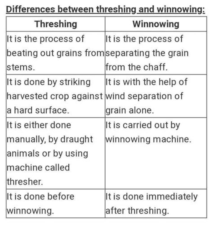 The process of beating out the grains from the harvested crop plants is called threshing. The grains or seeds are separated from the chaff. This process is carried out after the crop is harvested.How do harvesting threshing and winnowing differ from each other Class 8?