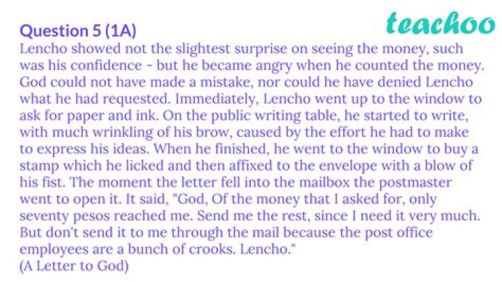 Answer: Lencho became angry when he received the letter because he was only given 70 pesos when he had asked for 100 pesos. He thought that god would not deny him his wish and hence concluded that someone at the post office must have stolen the money before delivering it to him.Why was Lencho angry when he counted the money Mcq?