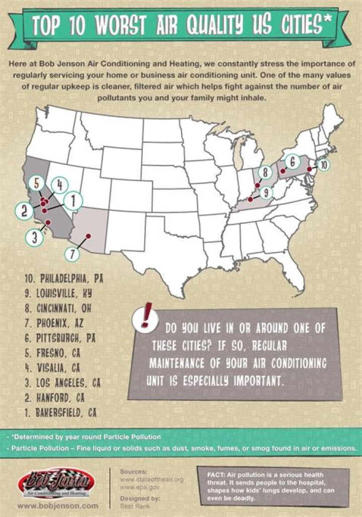 Los Angeles has the most contaminated air in the country. With a population of roughly over 10 million, the Los Angeles area is a large basin with the Pacific Ocean to the west and bounded prominently on the north and east by the San Gabriel and San Bernardino mountains.Which US cities have the best air quality?
