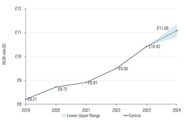 The current National Living Wage rate is £9.50 per hour. The government has said that the National Living Wage will increase every year until it reaches 60% of median earnings by 2024. This means that the National Living Wage is likely to be around £10.14 per hour in 2023.