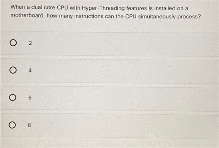 9. When a dual core CPU with Hyper-Threading features is installed on a motherboard, how many instructions can the CPU simultaneously process? Answers Explanation & Hints: With Hyper-Threading, two pieces of code can be processed simultaneously by a single core.