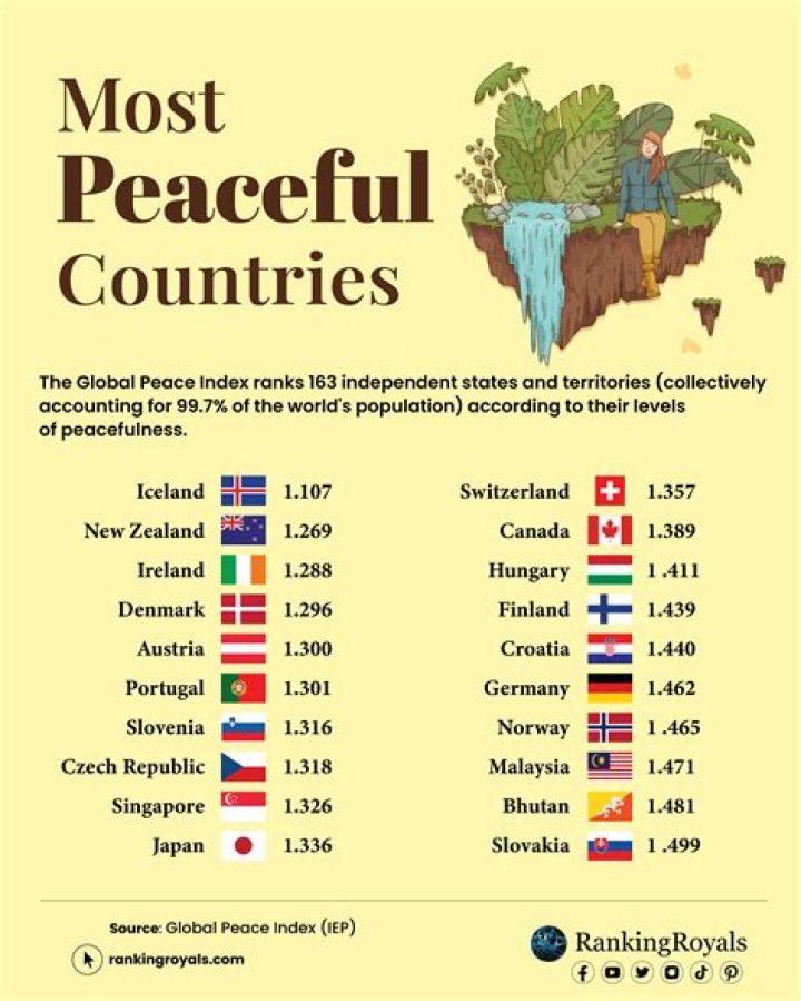 Iceland has maintained the title of the most peaceful country since the first the Global Peace Index launched 13 years ago. The 2019 GPI didn't record a single deterioration in peacefulness in Iceland over the last year. In fact, 78% of Iceland's indicators showed no change, and 22% improved.What is the calmest city?