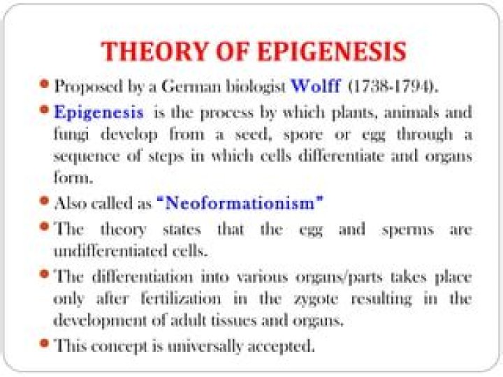 1600s- William Harvey proposed the theory of epigenesis, which states that an organism develops from the fertilized embryo by a succession of developmental events that eventually transform the embryo into an adult. You just studied 9 terms!