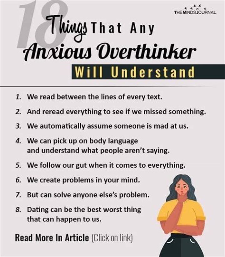 While overthinking itself is not a mental illness, it is associated with conditions including depression, anxiety, eating disorders and substance use disorders. Rumination can be common in people who have chronic pain and chronic illness as well, taking the form of negative thoughts about that pain and healing from it.What do you say to an Overthinker girlfriend?