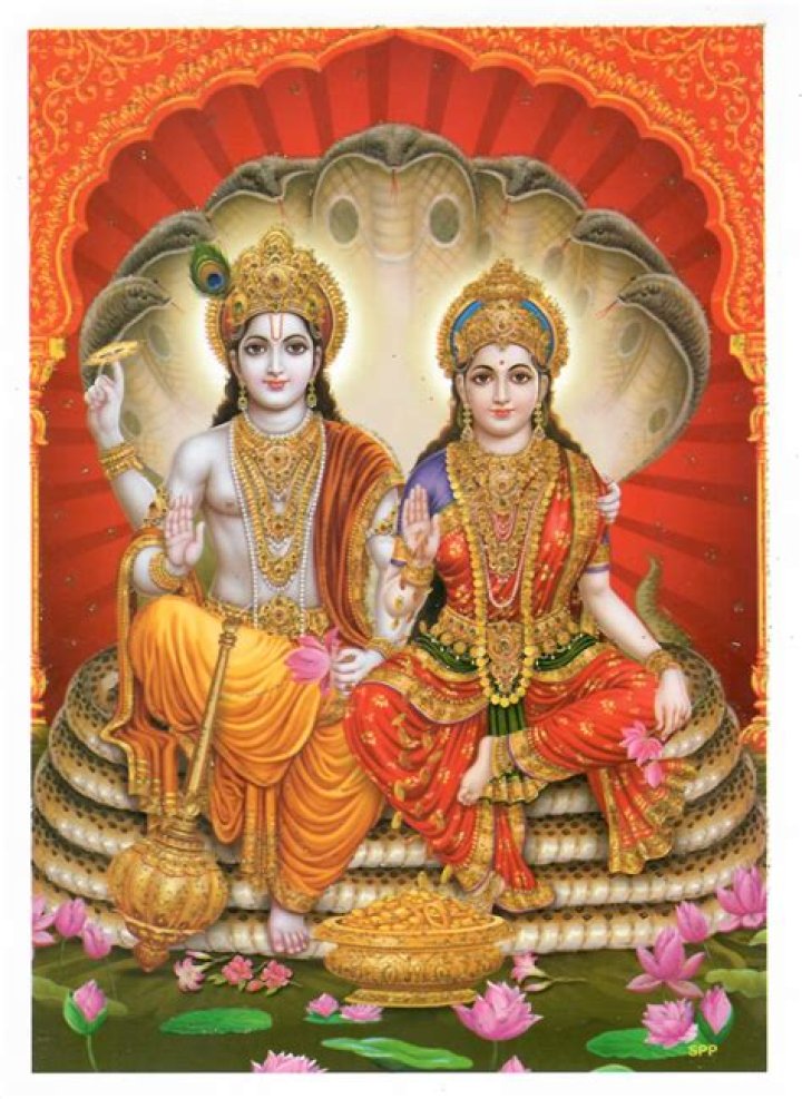 Lakshmi typically wears a red dress embroidered with golden threads, which symbolizes fortune and wealth. She, goddess of wealth and prosperity, is often represented with her husband Vishnu, the god who maintains human life filled with justice and peace.